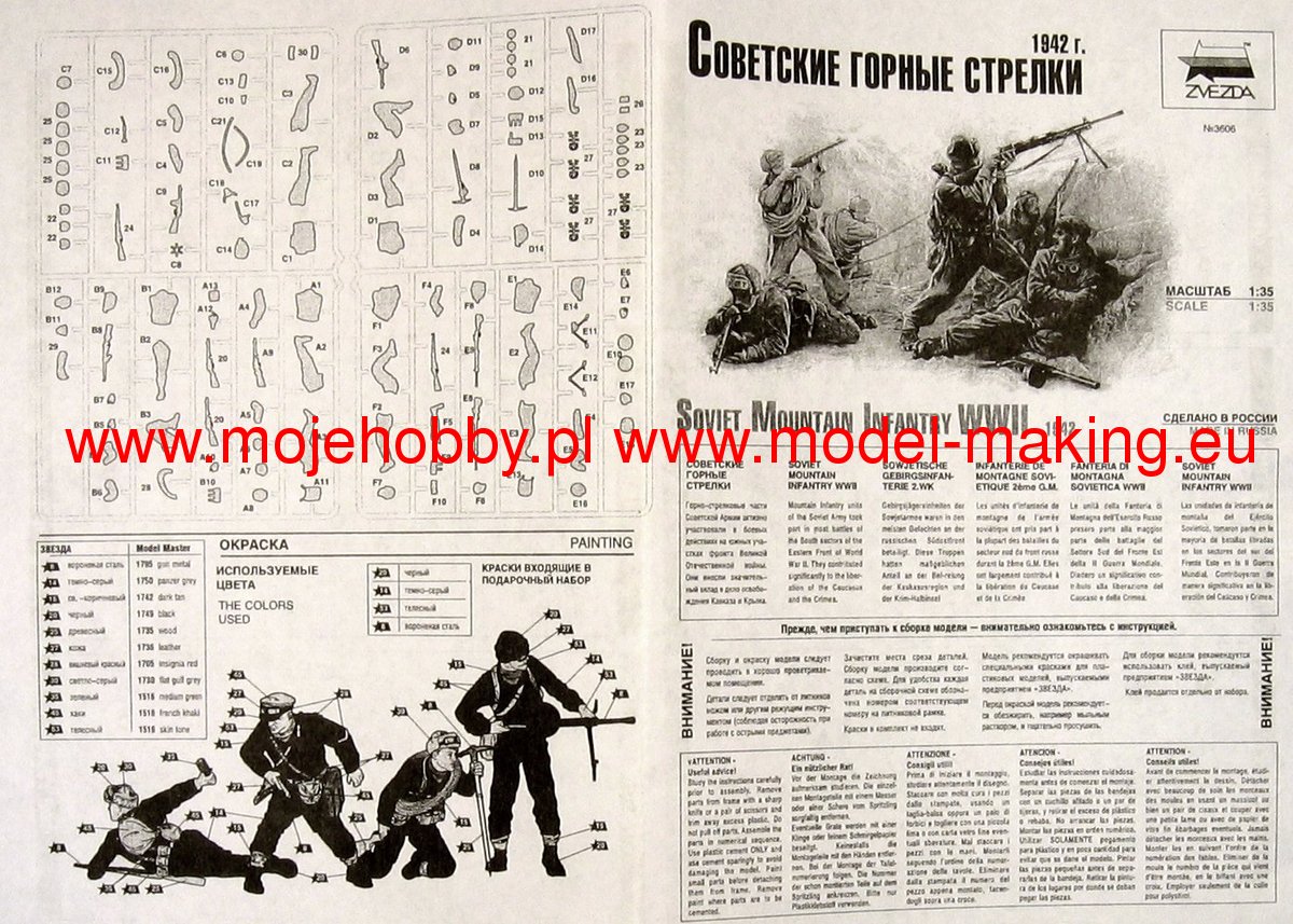 Горно-стрелковые части Советской Армии активно участвовали в боевых действиях на южных участках фронта Великой Отечественной Войны. Они внесли значительный вклад в дело освобождения Кавказа и Крыма. В 1942 г. советские горнострелковые отряды противостояли немецким альпийским стрелкам в районе Главного Кавказского хребта. Стрелки обладали высоким уровнем подготовки для ведения боевых действий в горной местности. Набор деталей из пластмассы для сборки 6 фигурок солдатиков. Солдатики собираются при помощи специального клея, выпускаемого предприятием Звезда. Состав набора: 2 отливки инструкция по сборке