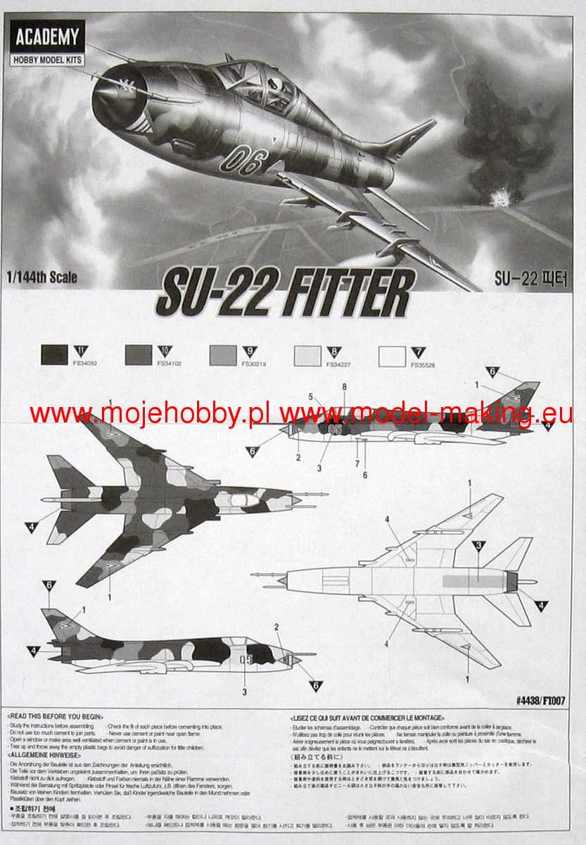 Описание С@хой-22 советский одномоторный бомбардировщик-штурмовик с изменяемой геометрией крыла, развитие машины С@хой-17, в основном для экспорта. Первая экспортная версия С@хой-22К с двигателем Tumanski R-29. Быстро была создана двухместная версия, получившая обозначение С@хой-22М3У. Модель С@хой-22М4, которая впервые была продана в 1979 году, была самой продаваемой. Он имел значительно модернизированное БРЭО с лазерными приборами измерения дальности и целеуказания (прибор Клон-54). Это был стандартный штурмовик 1980-х годов стран Варшавского договора. Технические данные: длина: 19,02м, размах крыла (со сложенными крыльями): 10,02м, высота: 5,1м, максимальная скорость: 1,7Ма, скороподъемность: 230м/с, максимальная дальность: 2250км, вооружение: стационарное - 2 НР-30 30-мм орудия, подвесные до 4070 кг груза