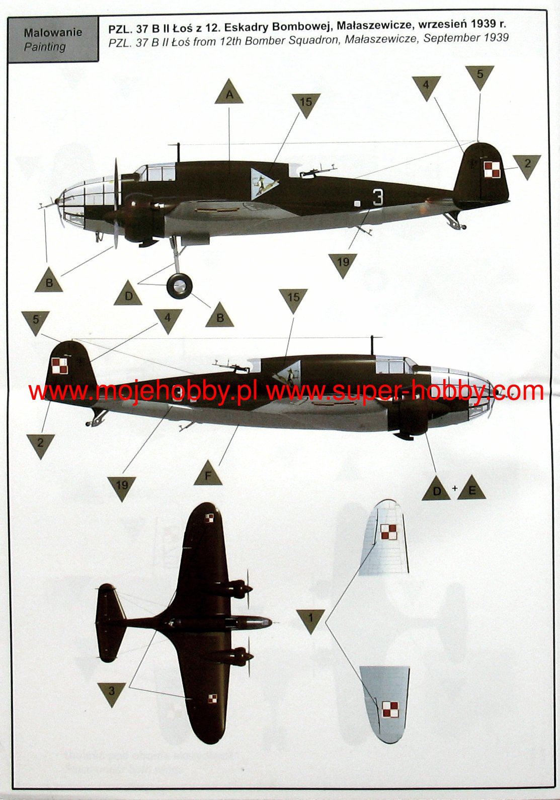 The PZL-37A / B Łoś is a Polish, two-engine low-wing bomber with a full metal structure, with a retractable landing gear. The flight of the prototype took place in December 1936, and serial production continued in 1937-1939. The PZL-37 was the most modern Polish military aircraft built before World War II and the world's first serial aircraft with a laminar wing profile. As a result, it developed a speed in excess of 400 km / h. The plane was among the world's top bombers at the end of the 1930s. By September 1939, 96 Elks had been built, 9 of which were crushed. 40 fought in the Bomb Brigade, while 37 were in the training squadron and in the Aviation Cadet School, and 5 in trials and 5 in repairs. The elk of the Bomb Brigade was fought by the German armored units near Radomsko, Pułtusk and Różan. 23 Łosie were evacuated to Romania, 2 landed in the USSR, 2 were captured by the Germans, and 60 were destroyed. The Romanian air force commandeered Łosie. Romanian characters and numbers from 201 to 220 were painted on them. They were used by Romania, which fought on the side of Germany with the Soviet Union, among others for the bombing of Odessa. Technical data (version B): length: 12.92 m, wingspan: 17.93 m, height: 4.25 m, maximum speed: 412 km / h, practical ceiling: 9250 m, maximum range: 1500 km, armament: fixed - 3 machine guns wz.37 7.92mm caliber, suspended - up to 2580 kg of bombs.