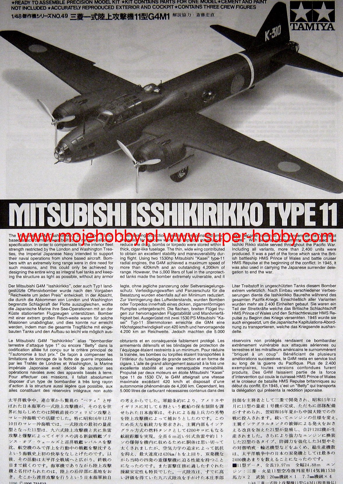 Mitsubishi G4M Hamaki (Japanese cigar) is a Japanese, twin-engine, long-range bomber and torpedo plane operating from land with a metal structure from the Second World War. The allied nickname for this plane is "Betty". The flight of the prototype took place in October 1939, and the entry into the line units took place in 1941. During the course of the war, five versions of the aircraft were created: G4M1 Model 11, G4M2 Model 22, G4M2a Model 24, G4M3 Model 34 and G6M1. The versions G4M1 and G4M2a were the most widely produced. The mentioned versions differed from each other, among others. power units, on-board weapons and, from the G4M3 version, self-sealing fuel tanks. The most unusual development version was the G4M2e, which was adapted to the drops of Ohk's MXY-7 pilot "suicide" flying bomb. The G4M of all versions served in the Pacific throughout the conflict. Airplanes of this type took part min. in the sinking of the battleships HMS Repulse and HMS Prince of Wales, in the fighting in the Philippines and in New Guinea, and very intensively used in the Battle of Gudalcanal. From 1943, their effectiveness decreased, which was caused by the introduction by the Americans of new fighters, min. F-6 and P-47. Admiral Isoroku Yamamoto died on board such a plane on April 18, 1943. Technical data (version G4M1): length: 19.97m, wingspan: 24.89m, height: 4.9m, maximum speed: 428km / h, rate of climb: 9.17m / s, maximum range: 2850km, maximum ceiling 8500m , armament: fixed - 4 type 92 machine guns, 7.7mm and one cannon, type 99, 20mm, suspended - up to 858 kg of bombs, or a torpedo of such weight.