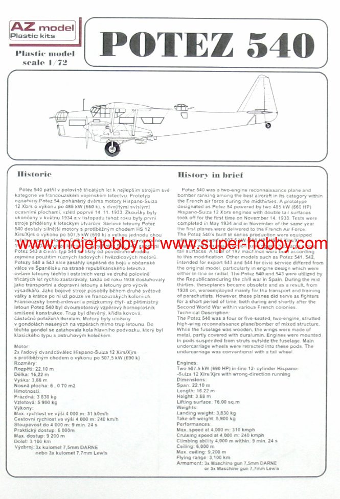 Potez 540 французский двухмоторный многоцелевой смешанный высокоплан времен Второй мировой войны. Полет прототипа состоялся в ноябре 1933 года. Машина использовалась во французской армии как дальний разведчик, транспортный и бомбардировщик. Первые версии оснащались двумя двигателями Hispano-Suiza HS 12 Xirs мощностью по 690 л.с. каждый, но позже стали использоваться более мощные двигатели (версии Potez 541, 542 и 543). Potez 540 использовался в боевых действиях во время Гражданской войны в Испании, но не имел там большого успеха. Конструкция быстро устарела в 1930-х годах, и к 1939 году большинство этих самолетов служило только в колониях, в основном в Северной Африке. Большая часть этих машин была уничтожена к 1943 году. Технические данные (версия Potez 540): длина: 16,2 м, размах крыла: 22,1 м, высота: 3,88 м, максимальная скорость: 310 км/ч, практический потолок: 10000 м, максимальная дальность: 1250 км, вооружение: стационарное от 3 ап до 5 пулеметов MAC 1934 калибра 7,5 мм, подвесных - до 900 кг бомб.