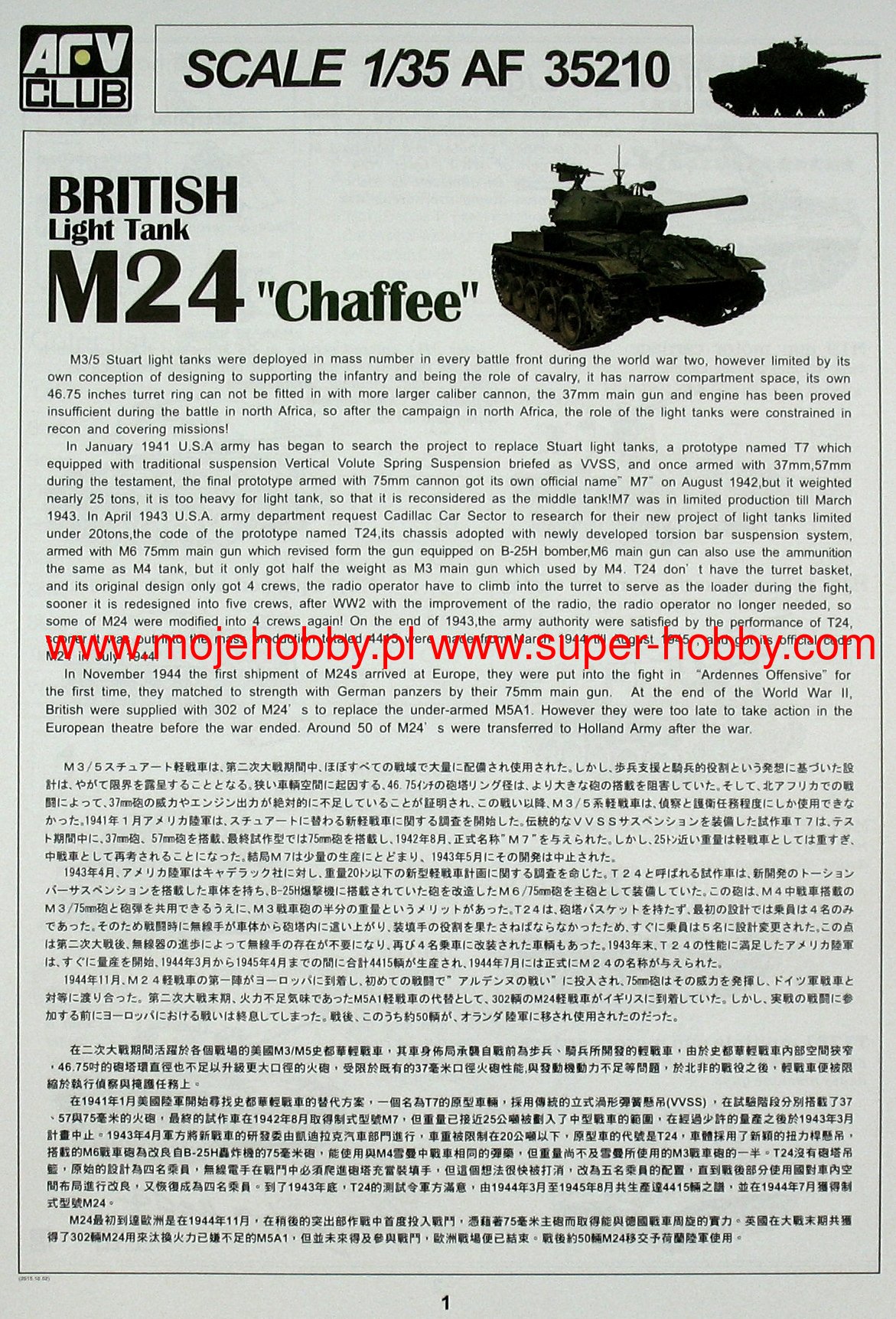 The M24 Chaffee was an American heavy light of the Second World War. The first prototypes were built in 1943, and serial production was carried out in the period 1944-1945. In total, about 4,700 copies of this tank of all versions were built. The M24 Chaffee was powered by a double engine Cadillac Twin 44T24 with a total power of 220 HP . It was armed with a single 75mm M6 cannon, two 7.62mm Browning 1919A4 machine guns and a single 12.7mm Browning M2HB machine gun. The M24 Chaffee was created as the successor to the M3 / M5 Stuart light tank series. In designing it, the emphasis was on stronger main armament (a 75mm gun instead of a 37mm gun), better shaped armor, greater off-road capability, and easier handling - especially in the engine compartment. During World War II, several specialized vehicles were built on the chassis of the M24 tank, including the M19 self-propelled anti-aircraft gun and the M41 Gorilla self-propelled howitzer. The first M24 Chaffee began to hit the line in mid-1944. They took part in the battles in Normandy, France and West Germany (1944-1945), but also in Italy in the period 1944-1945. After 1945, the M24 Chaffee was also exported to many countries, including Austria, Belgium, Chile, France, Greece and Pakistan. M24 took part in several conflicts after the end of World War II, including the Korean War (1950-1953), the war in Algeria (1954-1962) and Indochina (1945-1954).