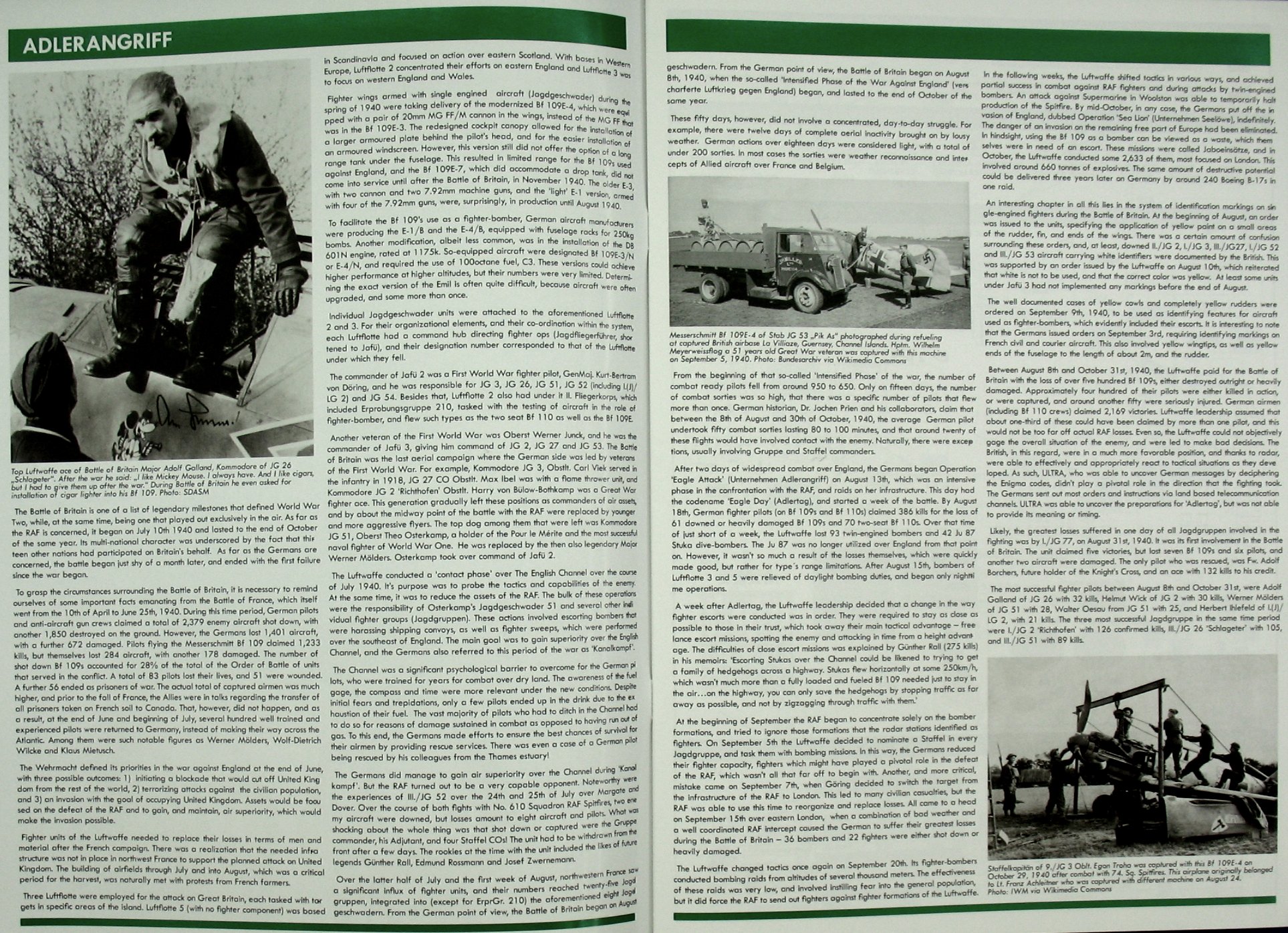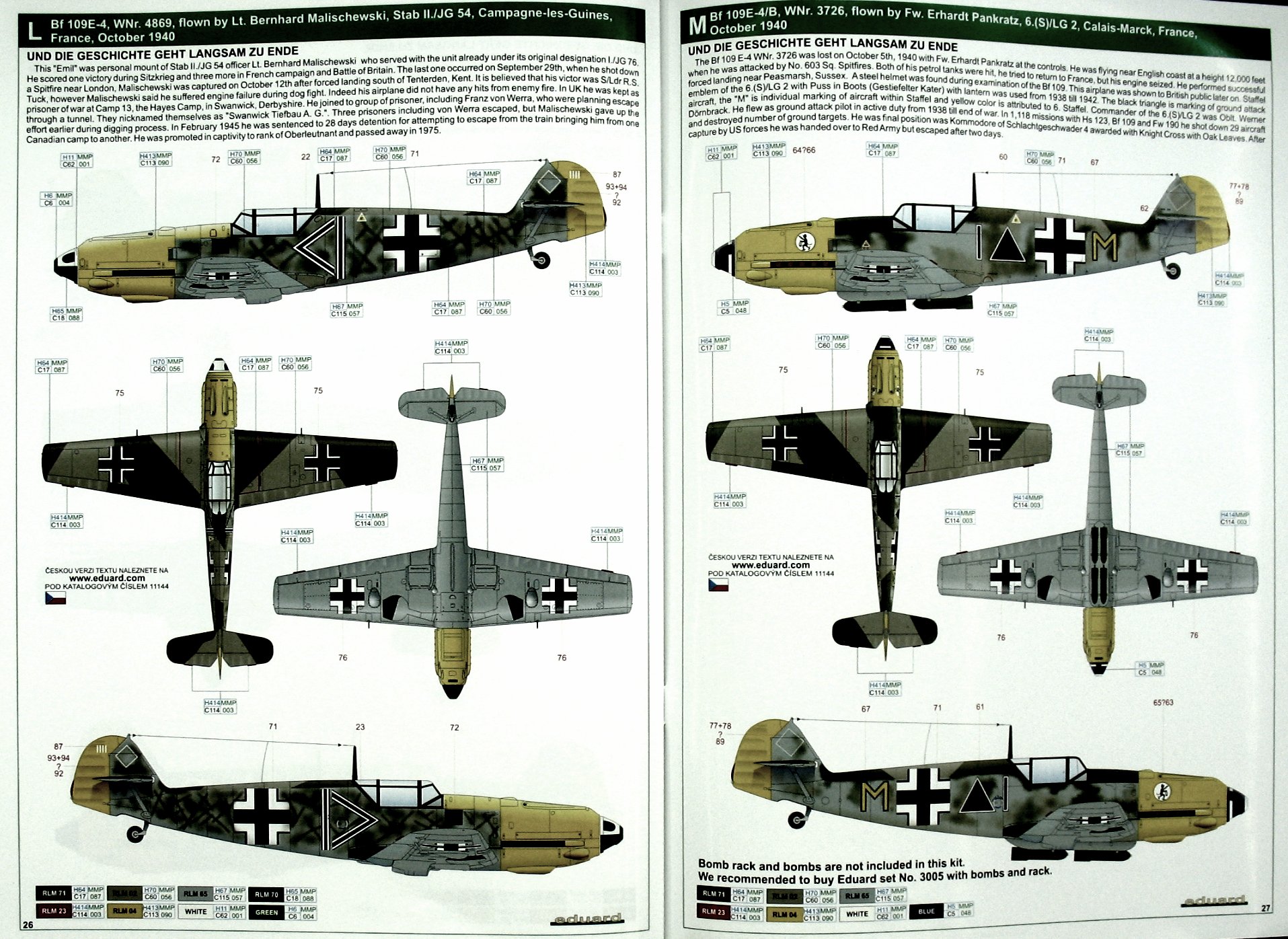 The Messerschmitt Bf-109 is a German metal-structure single-engine fighter in a low wing configuration with a classic tail. It turned out to be the basic and most produced Luftwaffe fighter during World War II. The flight of the prototype took place on May 29, 1935, and serial production continued in the years 1936-1945. In total, it is estimated that a total of about 35,000 Messerschmitt Bf-109 fighters of all varieties were produced, many of which ended up in the Czech and Israeli air forces after the war. The roots of the Bf-109 go back to the competition announced in 1933 by the Luftwaffe for a new fighter plane. In competition with the He-112, the Bf-109 project initially lost, but thanks to Willie Messerschmitt's intrigues, the project could continue and eventually he was the winner of the competition, becoming the Luftwaffe's primary fighter. Several main variants of the Bf-109 were developed in the course of production. The first pre-production series was the Bf-109B (Berta) with different versions of the Junkers Jumo 210 (A or Da) engine. They were tested in Spain from 1937 during the Civil War. The next version is the Bf-109C (Caesar). They had a different engine than the B version, and extensive armament consisting of two 20mm and 2 HP 7.92mm cannons. These machines also fought in the skies of Spain. The third version is the Bf-109D (Dora) with the Junkers Jumo 210 Da or Daimler-Benz DB 600 engine. It fought in the September campaign, but at the turn of 1939/1940 it was replaced by the E version. The most famous model was the Bf-109E (Emil) with a Daimler-Benz 601A or N engine. It was the first to use a three-blade, not a two-blade propeller. Bf-109E fought in the French campaign, over England, and in North Africa and on the Eastern Front. The ace who started his career on the Bf-109E was the famous Adolf Galland. The next version is the Bf-109F (Friedrich), which, according to the German pilots, was the most aerodynamically perfect. It sowed the changed shape of the fuselage, wings, cabin fairings, but no new engine was used. It was put into service at the turn of 1940/1941. As part of the development of the design, further Bf-109 specifications were developed, of which the G (Gustav) version was produced in the largest number of copies. The most important change increasing the machine's performance was the installation of a new 12-cylinder Daimler-Benz DB605A engine with 1475HP. The armament of the Bf-109G was a pair of 13mm machine guns located in the fuselage in front of the cockpit fairing, and the MG151 20mm or heavier MK108 30mm cannon. The last mass-produced version was the Bf-109K (Kurfirst), which production started in October 1944. A Daimler-Benz DB 605DB or DC unit was used as the engine. The Bf-109K was the fastest version produced during World War II, reaching up to 730 km / h. Apart from that, two versions were created - H and Z, but they were rather experimental versions and their mass production did not start. Subsequent improvements in propulsion and armament made the Messerschmitt Bf-109 one of the most dangerous fighters of World War II, and at the same time showed the great potential of the slightly angular airframe created by Willi Messerschmitt. Technical data (version Bf-109 G-6): length: 8.95 m, wingspan: 9.92 m, height: 2.6 m, maximum speed: 640 km / h, rate of climb: 17 m / s, maximum range: 850 km, maximum ceiling 12000m, armament: fixed - 2 MG131 13mm machine guns and 1 MG151 20mm cannon, suspended - 250 kg bombs, or 2 Wfr missile launchers. Gr. 21. 3_edu11144_instruction_sheet.pdf